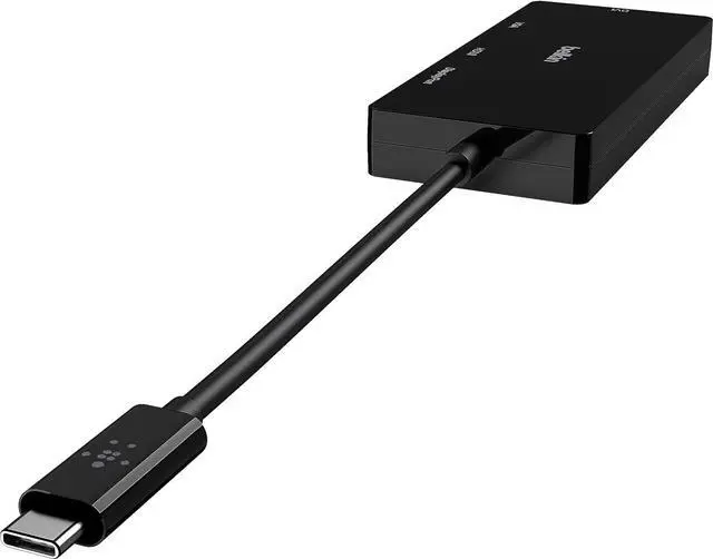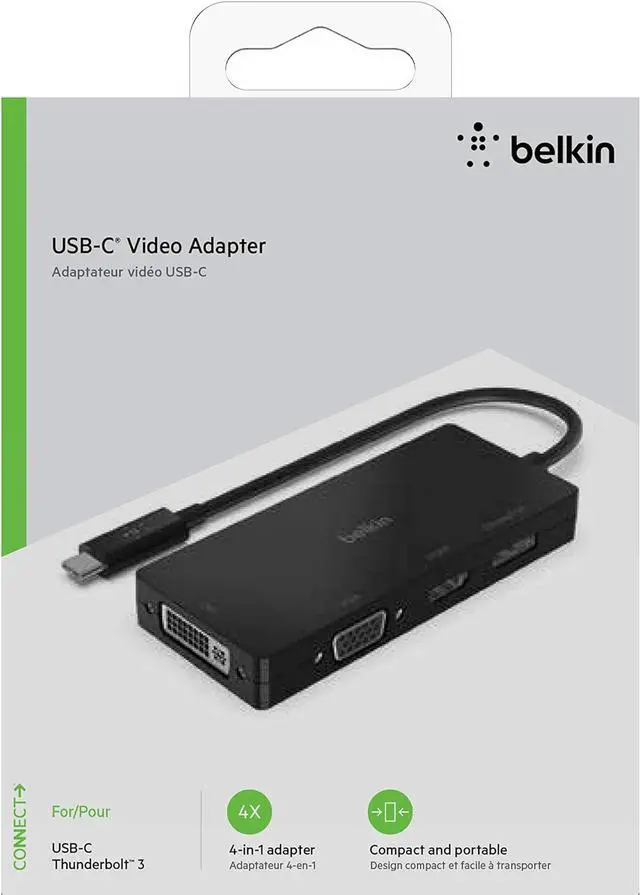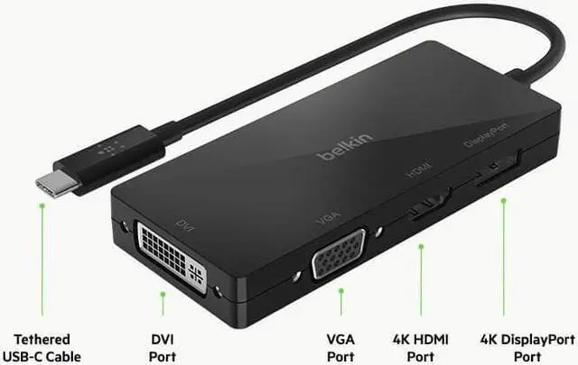 A dedicated, tethered USB-C cable provides easy plug-and-play compatibility with Mac and Windows laptops and other USB-C devices. At a glance, this USB-C to Multiport Adapter includes HDMI, VGA, DisplayPort, and DVI ports. This video adapter connects to your devices USB-C port and supports video resolutions- up to 4Kx2K@60Hz and comes with a Belkin 2-year warranty.