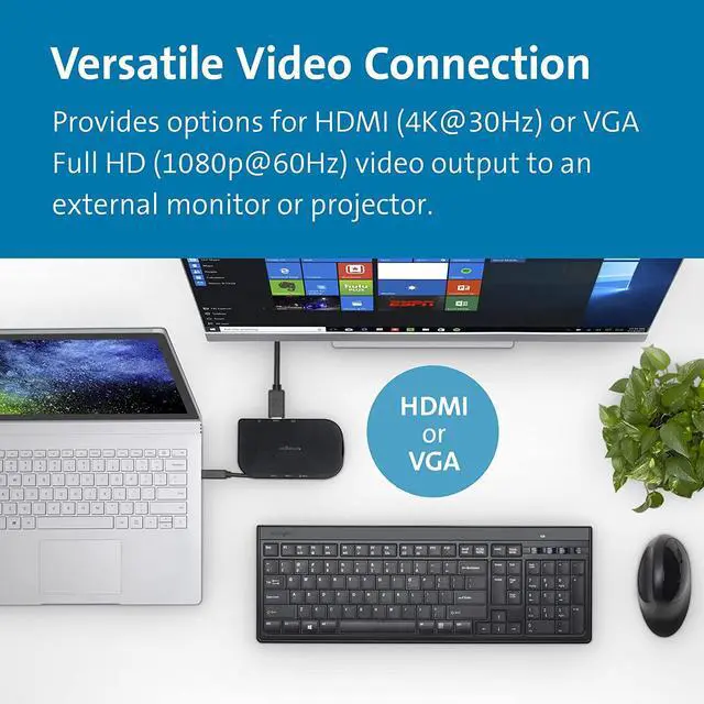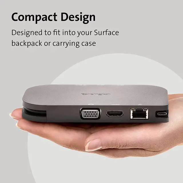 Kensingtons SD1610P USB-C Mini Mobile 4K Dock with Pass-Through Charging was designed for Microsoft Surface. Users can expand their mobile or desktop setup to include a full HD (VGA) or 4K (HDMI) display and connect and charge their favorite USB accessories. Whether in a temporary workspace or a conference room, the SD1610P keeps users productive and powered up. Built on USB-C technology and Power Delivery 3.0, users can connect with confidence to Microsoft Surface Go, Surface Book 2, Surface Laptop 3, Surface Pro 7 and Surface Pro X knowing the SD1610P will let them expand their workspace, use their favorite accessories, and power their Surface at the same time*. *3A/60W (or higher) USB-C charger required (not included)