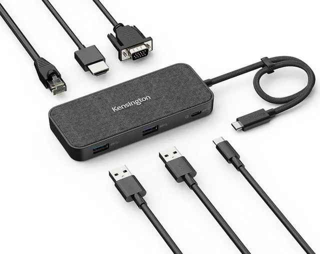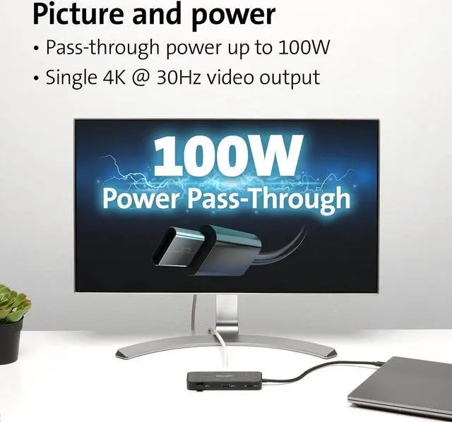 The SD1650P USB-C Single 4K Portable Docking Station with 100W Power Pass-Through - Win/Mac/Chrome/iOS/Android delivers 100W of pass-through power, single 4K (HDMI @ 30Hz) or 1080p (VGA Full HD @ 60Hz) video; and six ports for productivity on the go, including 5Gbps speeds via two USB-A 3.2 Gen1 ports, and a USB-C 3.2 Gen1 port; and a 1Gbps Ethernet port. Supports USB-C iPads and Samsung DeX, for a computer-like experience from Samsung Galaxy, Note, and Tab devices. Includes cable storage clips for the included 11-inch (27.9cm) cable.