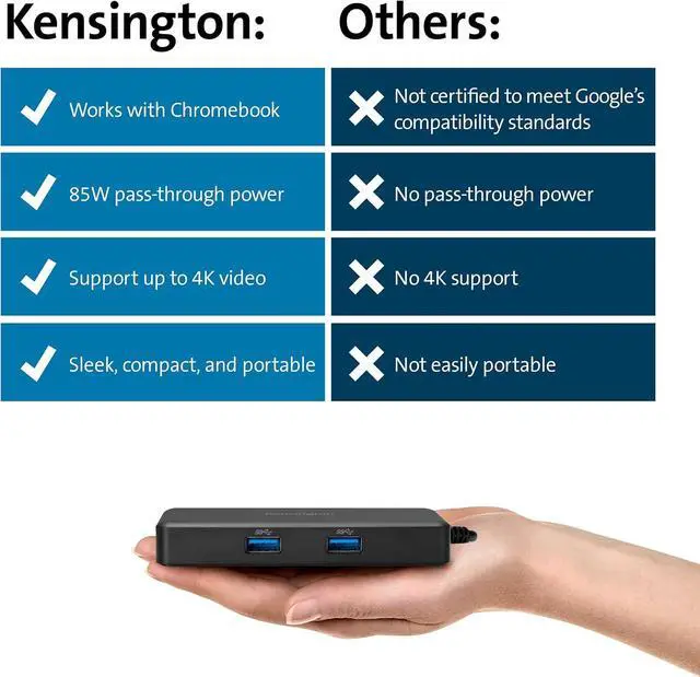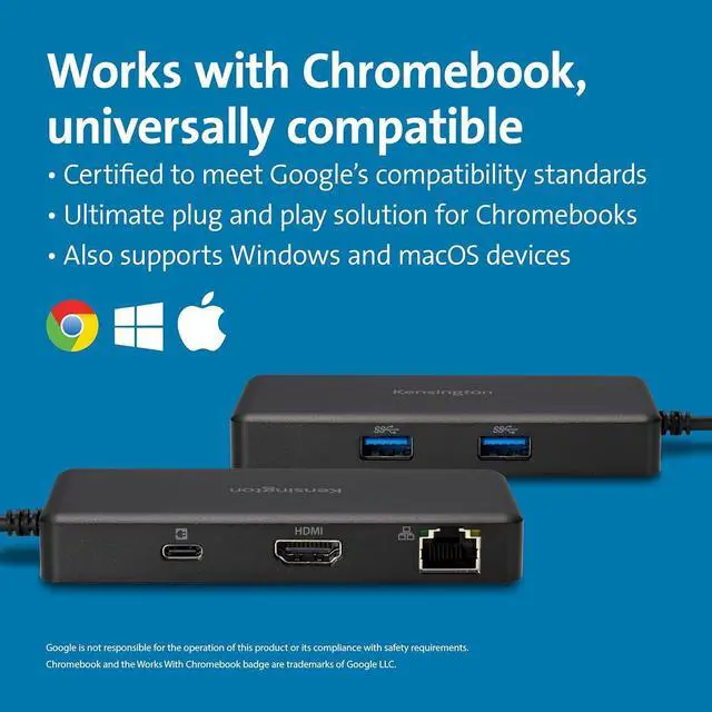 Take the worry out of knowing which dock is compatible with your Chromebook. The portable G1000P USB-C Mini Dock is certified to meet Googles compatibility standards its the ultimate plug-and-play solution for Chromebooks, while also compatible with Windows and macOS devices. Its compact form factor contains powerful connectivity options to extend productivity capabilities, with support for up to Single 4K @ 60Hz, 85W Pass-Through Charging, two USB-A 3.2 Gen1 5Gbps ports, one USB-C 3.2 port designed for power pass through only, and Gigabit Ethernet.
