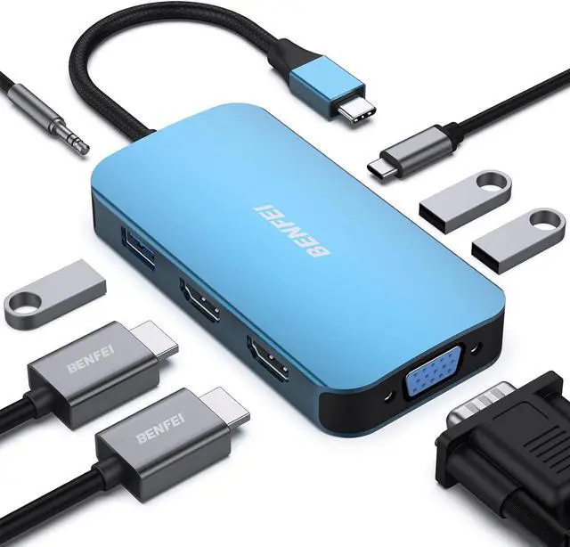 BENFEI USB C MST HUB 8in1 with USB-C to 2*HDMI/1*VGA, USB-C to 3*USB 3.0/100W Power Delivery/3.5mm Aux Audio, Compatible with iPhone 15 Pro/Max, MacBook Pro/Air 2023, iPad Pro, iMac, S23, XPS 17