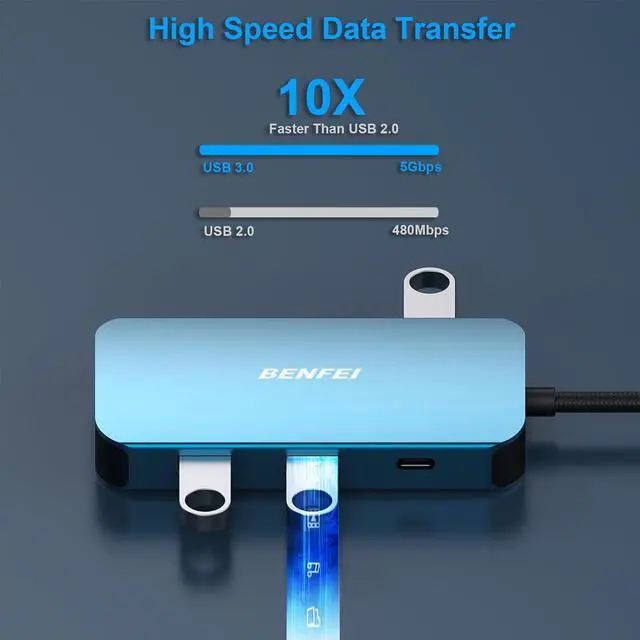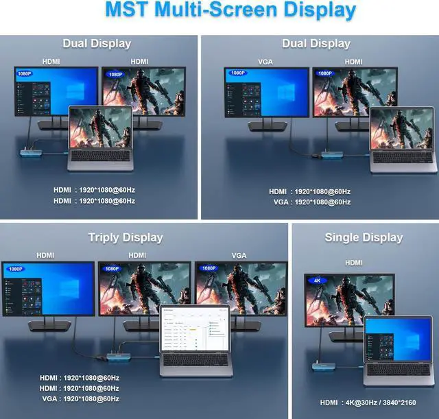 • MultiScreen Solution - With MST feature support, BENFEI USB Type-C HUB could support up to 3 maximum screen output, 2*HDMI and VGA. The screen could be identical or different depends on your computer setting. The resolutions could be up to 3840*2160@30Hz, 1920x1080@60Hz (1080p Full HD) including 720p, 1600x1200; Please pay attention: the supported resolution is up to the output combination, please refer to the product description.