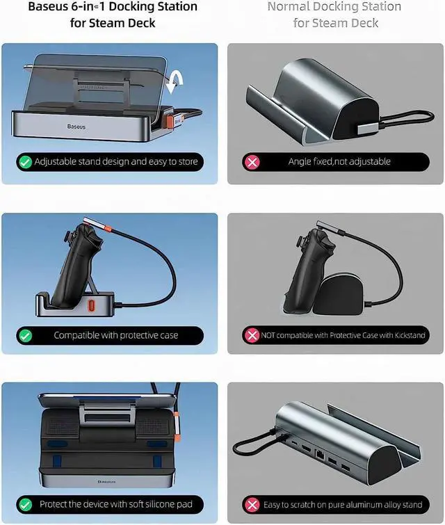 Docking Station for Steam Deck and ROG Ally, Baseus GameX 6-in-1 Steam Deck Dock with HDMI 4K@60Hz, 1000Mbps Ethernet, 3 USB-A 3.0 ports and PD 100W Support Fast Charging. 6-in-1 Steam Deck Dock and Rog Ally Dock with adjustable design.