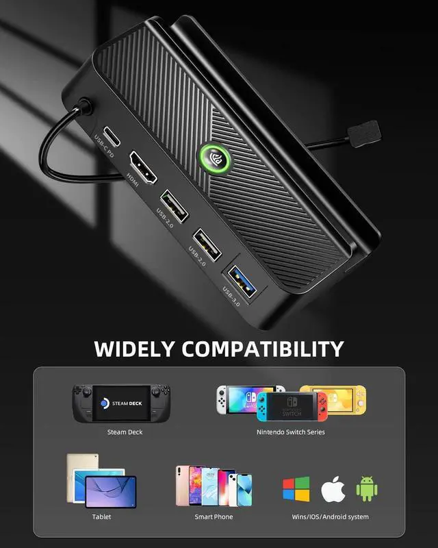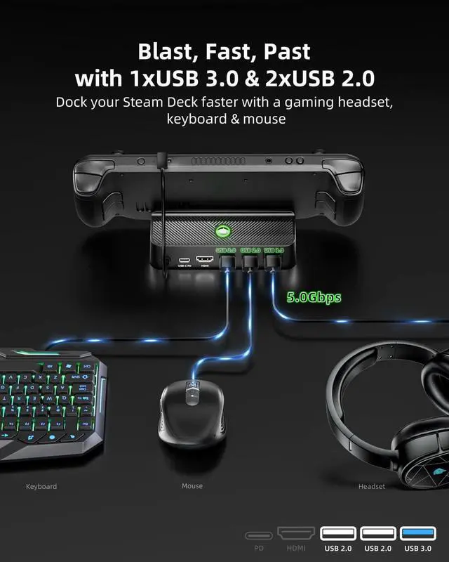 5-in-1 TV Docking Stand for Steam DeckEasySMX TV dock is designed for Steam Deck, equipped with an 4K HDMI output, a USB Type-C PD fast charging port and USB 3.0 data ports. You can enjoy playing video games on TV while your device is charging as well, 3 USB ports will let you acess to keyboards and mouse etc.