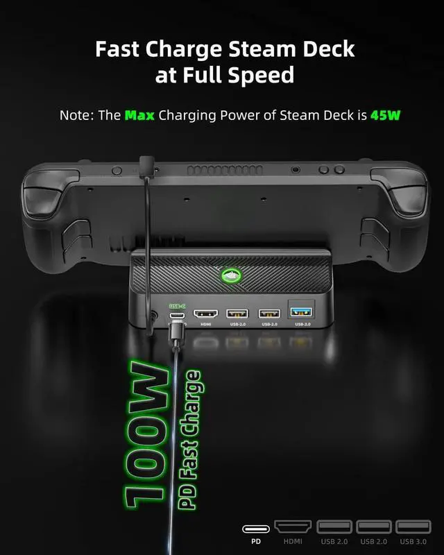 Fast Charging Speed for Steam DeckEasySMX dock supports Max 100W, which is enough to charge your Steam Deck, recommend use original AC adapter, the Max charging speed of Steam Deck is 45W.