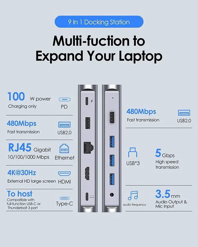 • Powerful Than USB C Hubs - The USB C Dock provides USB C to 4K HDMI, Gigabit Ethernet, 3.5mm Audio, 3 USB 3.0, 2 USB 2.0 for better compatibility. The USB C Docking Station with power delivery can pass through up to 100W power(MAX) to the connect host and peripherals (Note: It is not power supply)