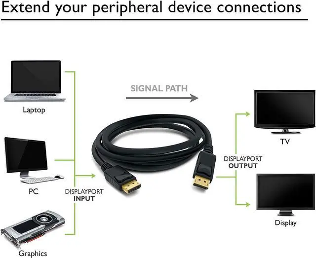 Convenient cable directly connects a DisplayPort (DP, DP++, DisplayPort++) equipped computer to a HD monitor or projector with DisplayPort input; Transmits high definition audio and video from your computer to a monitor for video streaming or gaming; Connect and configure your monitor for an Extended Desktop or Mirrored Displays; Supports video resolutions up to 4K (3840x2160, Ultra HD) and 1080P (Full HD), and flawless audio pass-thru for uncompressed digital 7.1, 5.1 or 2 channels; Gold-plated connectors, bare copper conductors, and foil & braid shielding combine together to provide both superior cable performance and reliable connectivity; DisplayPort connector with latches provides a secure connection with a release button that must be depressed before unplugging .