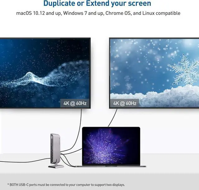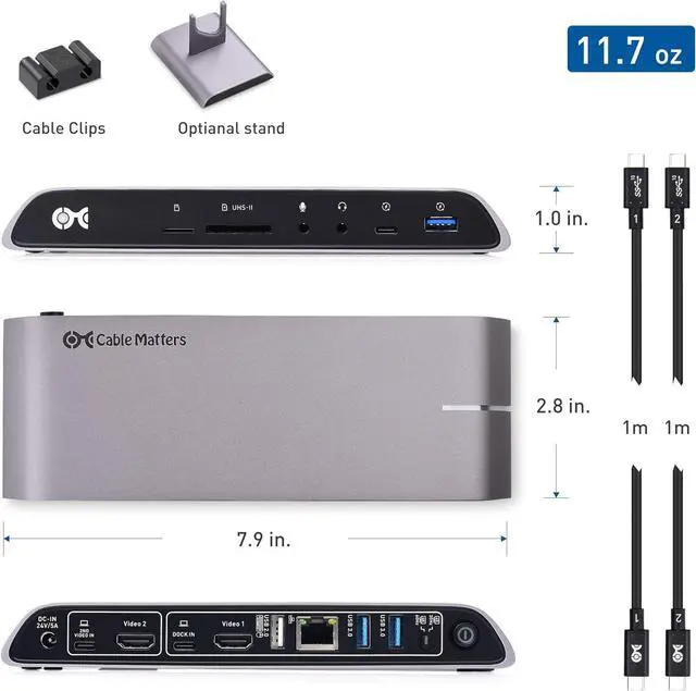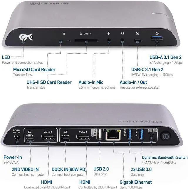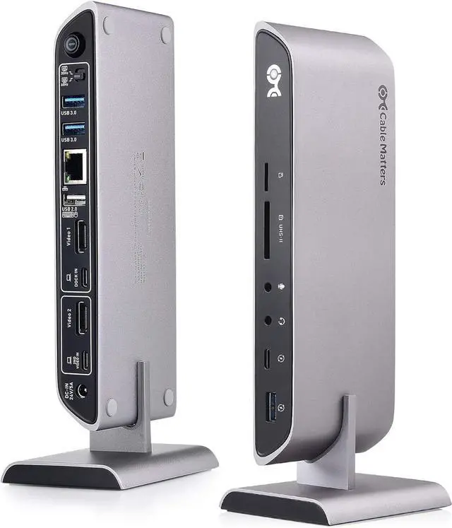 The Cable Matters Dual Input USB-C Docking Station with 80W Power Delivery provides all the necessary ports to connect a thin Windows laptop with two USB-C or Thunderbolt 3 ports. It provides instant connectivity to two HDMI displays, an Ethernet network, USB-C and USB-A devices and SD memory cards.