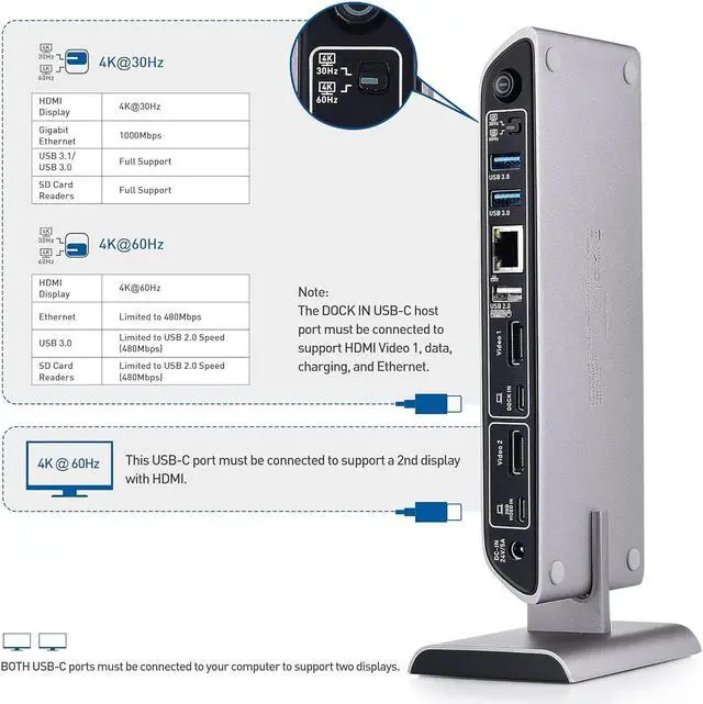 A 4K/30Hz or 4K/60Hz switch on the Docking Station offers a choice between connecting dual 4K@60Hz displays with Fast Ethernet and USB 2.0 or dual HD@60Hz displays with Gigabit Ethernet and USB 3.0. Switch to the mode for your desktop requirements.