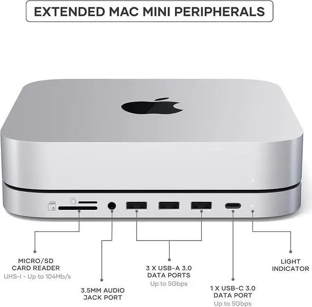 Multiport Adapters Hubs Power & Charging Peripherals Technical DetailsAdditional Information Feedback Website (Online)Store (Offline) Stand & Hub for Mac Mini with SSD Enclosure Patented Design Built-in SSD Enclosure USB-C Expansion Hub