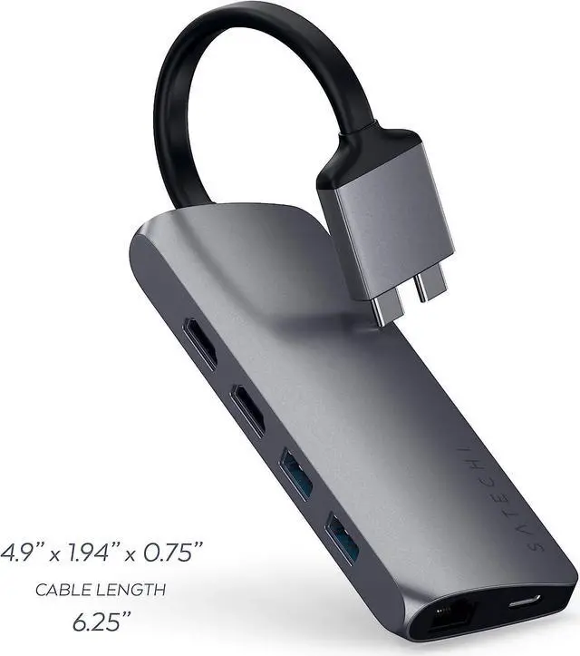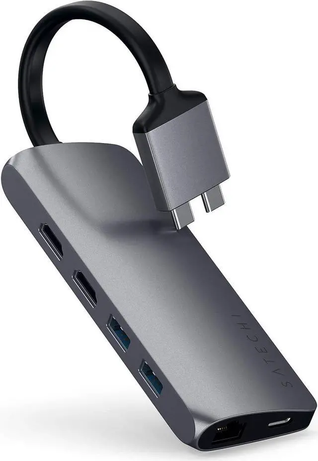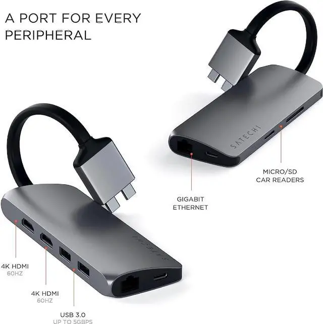 Multiport Adapters Hubs Power & Charging Peripherals Technical DetailsAdditional Information Feedback Website (Online)Store (Offline) Satechi Type-C Dual Multimedia Adapter Patent Pending Design Dual 4K HDMI Display A Port for Every Peripheral Important Notes