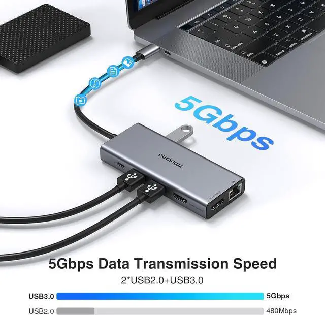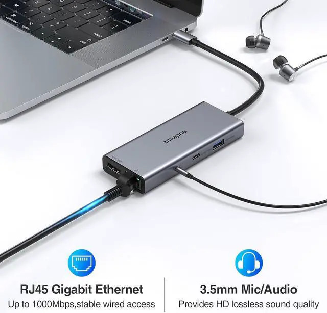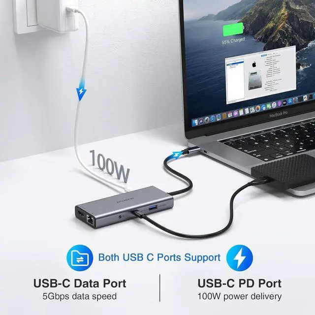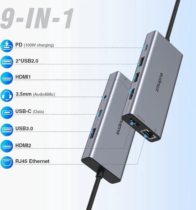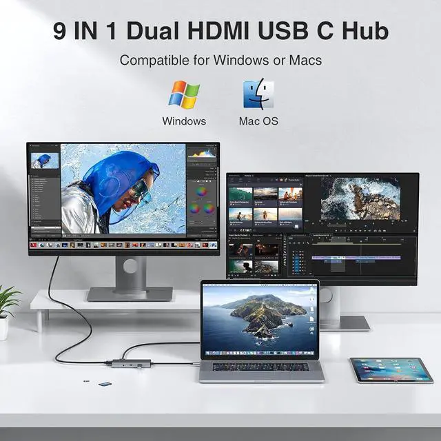 • Macbook Docking Station 9 in 1: This macbook usb c adapter can easily convert your Macbook\u2019s usb c/thunderbolt 3/type C port into 9 ports: HDMI 1 (4K@60Hz), HDMI 2 (1080P@60Hz),100W USB C Power Delivery port (only charging),Gigabit Ethernet(1Gbps),1 USB 3.0, 2 USB 2.0,USB C Data Transfer port(Speed up to 5Gbps),3.5mm Mic/audio port. Macbook air hub support both mirror and extend mode on MacOS, Images are Different on external monitors.