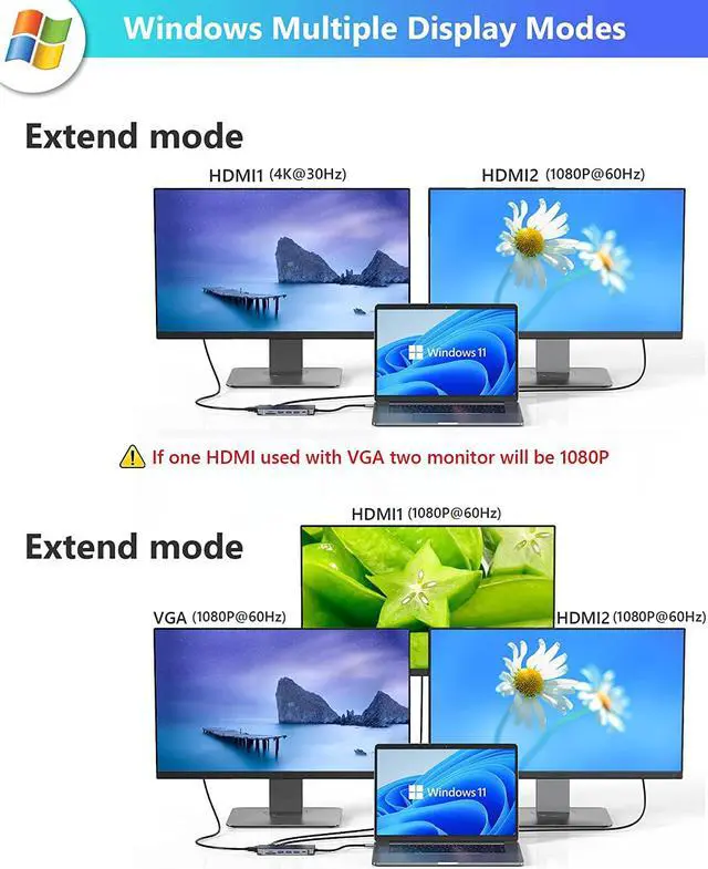 • Docking Station Dual Monitor 2 HDMI (4k)&Triple Monitor VGA (1080P)Single use HDMI 1 can be up to 4K@60Hz under DP1.4 source. When connect 2 monitors, HDMI resolution will be 4K@30Hz (DP1.4). Display output will be 1080P@60Hz when dual or triple display with VGA. With this dual hdmi docking station for dell laptop, you can easily handle with multi-screen setup, make your work/life more efficient. Please Note: Windows support MST and SST mode, Mac OS only support SST mode.