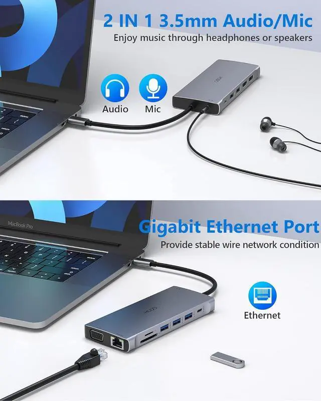 • 100W PD Charging&Gigabit EthernetUSB C ethernet adapter provides super-speed stability ethernet condition for you(up to 1 Gbps), plug and play, which make your life easier.Docking Station for hp also support Power Delivery, thunderbolt 3.0 technology with a rated power of 87W and offers significantly faster charging time, no need to worry about power storage. In addition, there is a 3.5mm audio port to put in your headphone, so that you can enjoy the music and movie without disturbing others.