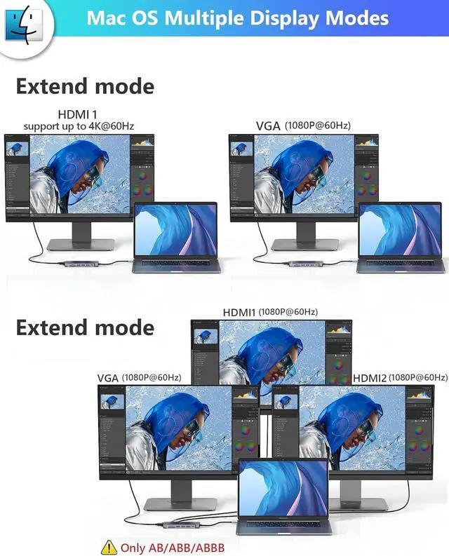 Not support Extend Mode : A-B+C or A-B+C+D(which only support for windows laptop)