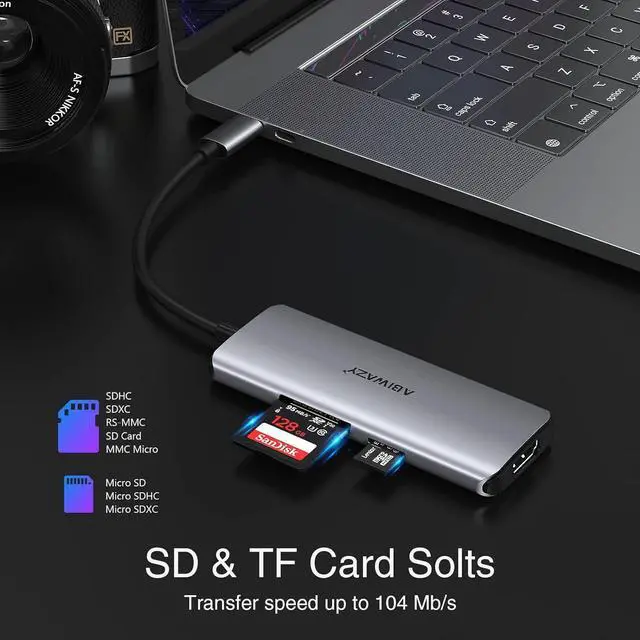 This USB C To USB adapter's sd/tf card reader speed up to 104Mb/s,both slot can work at the same time.