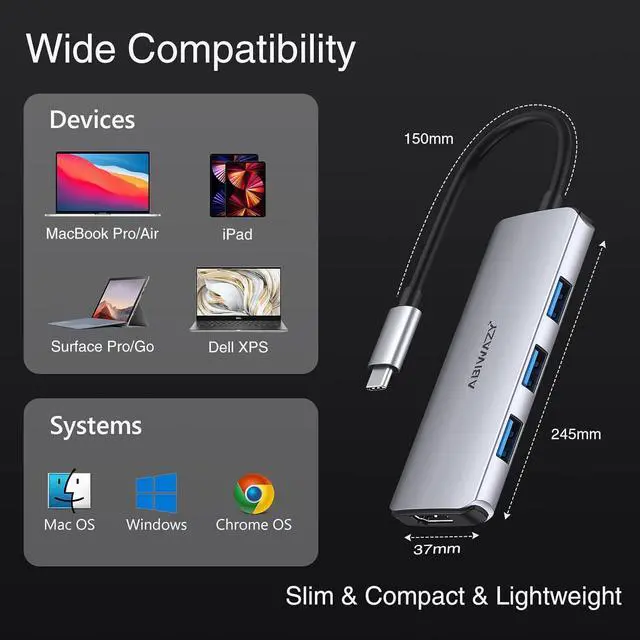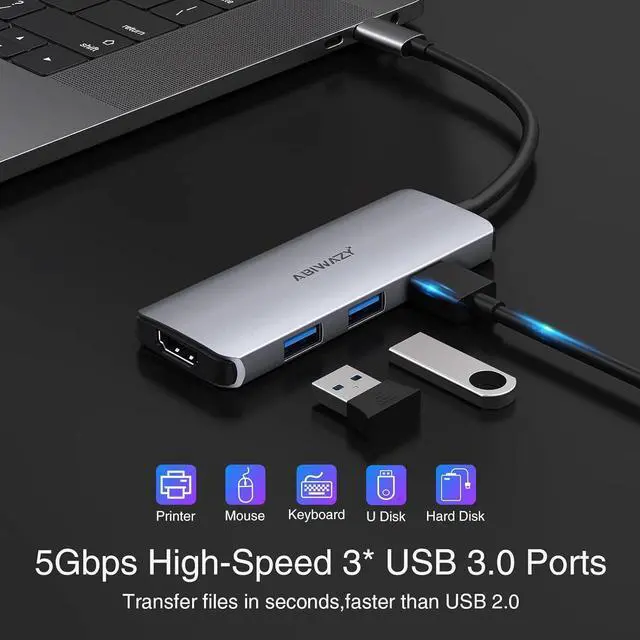 This ABIWAZY USB C MacBook hub type c multiport dongle has 3 USB 3.0 ports,data transfer speed are up to 5Gbps.