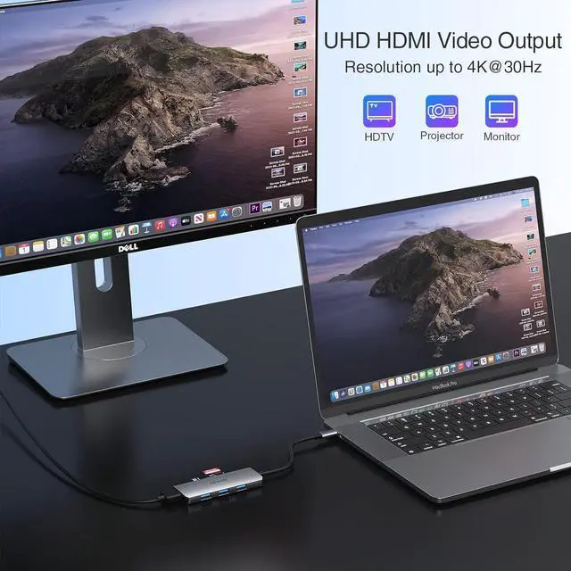Equipped with a 4K@30Hz HDMI port, three USB3.0 ports and SD/TF card solts, our multiport usb c adapter expends more possiblity of laptops.