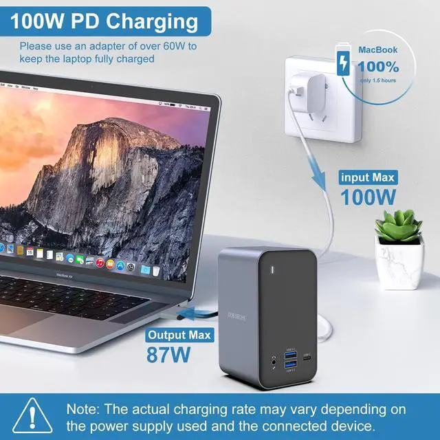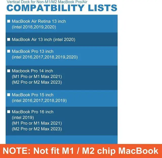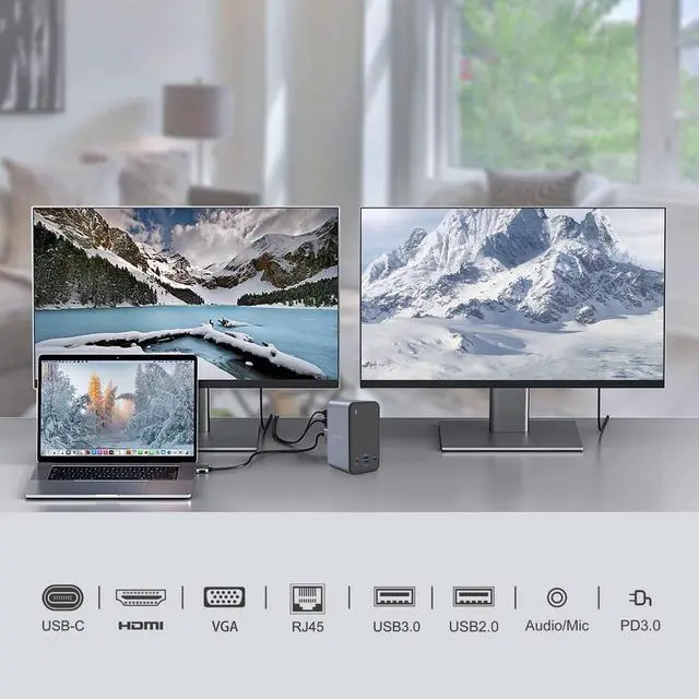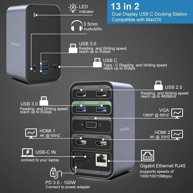 Compatible MacBook Pro 13-inch 2016/2017/2018/2019/2020 (Intel chip); MacBook Air (Retina 13-inch) 2018/2019/2020 (Intel chip); MacBook Pro 14-inch 2021(M1 Pro or M1 Max chip); MacBook Pro 15-inch 2016/2017/2018/2019(Intel chip); MacBook Pro 16-inch 2019 (Intel chip); MacBook Pro 16-inch 2021(M1 Pro or M1 Max chip); MacBook Pro 14-inch 2023(M2 Pro or M2 Max chip); MacBook Pro 16-inch 2023(M2 Pro or M2 Max chip)Incompatible1. All Windows laptop;2. MacBook Pro before 2015(included 2015), MacBook Air before 2018(included 2018); 3. Mac mini, iMac, Mac Pro, Mac Studio1. NOTE M1 Pro, M1 Max, M2 Pro, M2 Max chip support connect Dual Displays2. NOTEM1 chip, M2 chip only can get one external monitorUSB C Docking Station Package 1 x DOB SECHS 13-in-2 USB C Docking Station (2.4inch x 4.7inch x 2.8 inch); 1 x Dual USB-C Cable (40 inches/3.3ft); 1 x User Manual; 1 x Original Box Laptop Docking Station for macOS with 13 Ports: 1 USB-C Power Deliveryports, 2 HDMI port, 1 x VGA, 1 x USB C, 4 x USB A 3.0 (5Gbps) , 2 x USBA 2.0 (480Mbps) ports, Gigabit Ethernet, 3.5mm audio.Plug and play, nodriver needed, quickly start multi-screen work