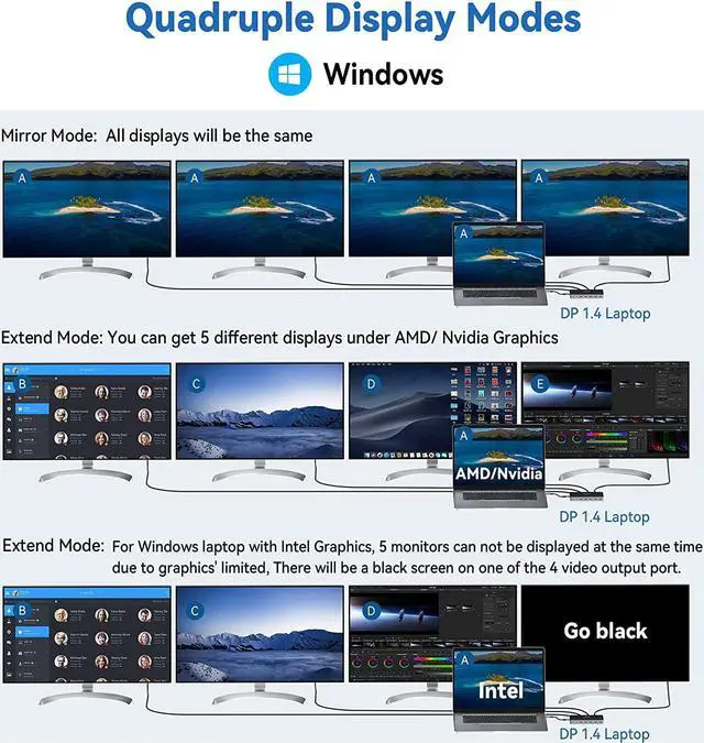 About 4 Screens: ONLY "DP1.4 and AMD processor computers" or "Apple models listed after 2018 with dual systems installed" can achieve 4 screens when using the WIN system.