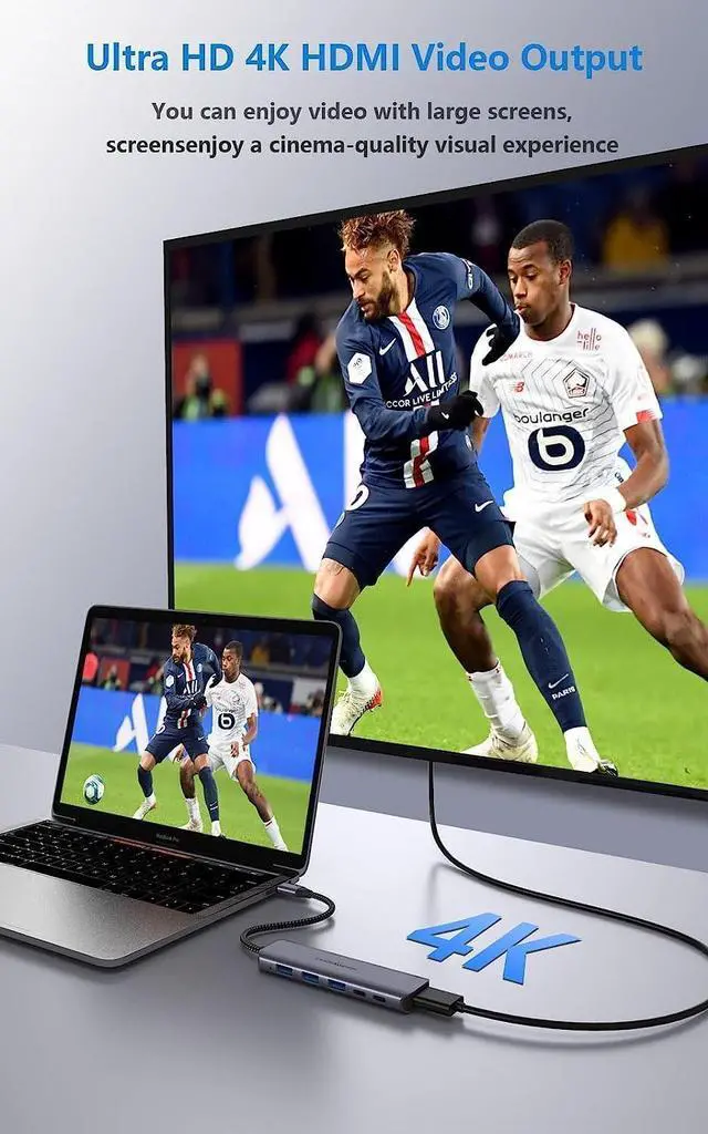 This USB-C Hub is equipped with a 4K@30Hz HDMI port, 3 USB-A 3.0 ports, 1 USB-C data ports, 1 PD 100W charging port , supports HDMI large screenexpansion, Keyboard/mouse/U disk/mobile hard drive reading, etc., supports upto 100W power supply, get rid of the single notebook interfacetrouble, multiple devices can be used simultaneously;