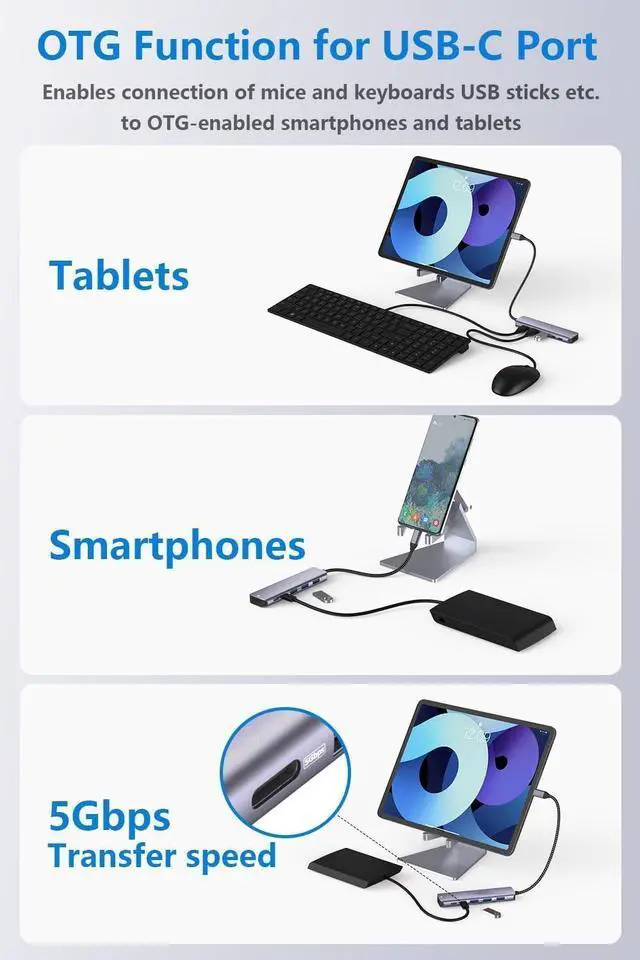 This USB C to HDMI adapter is equipped with 3 USB 3.0 adapter ports and 1 USB C data port,data transfer speeds is up to 5 Gbps. 10 times faster than USB 2.0,it takes only seconds to transfer a 1GB video file.