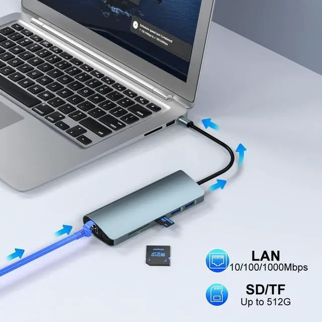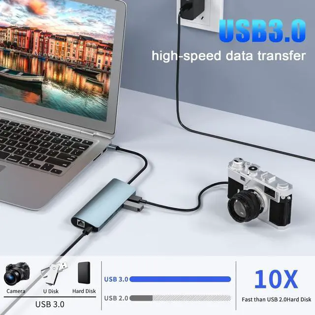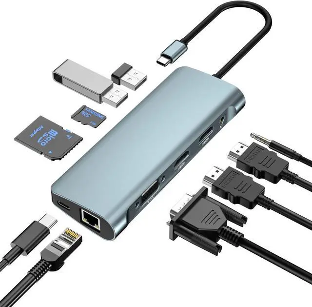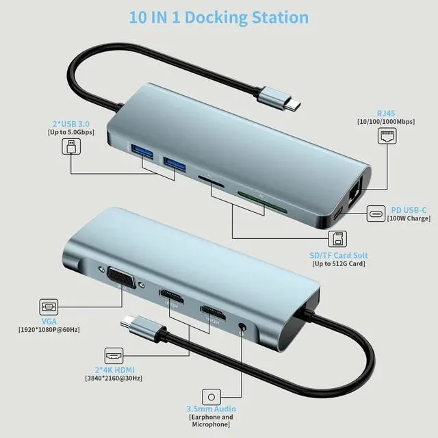 10 in 1 USB Docking StationThis USB C Hub has HDMI, VGA, Adaptive 10/100/1000M Ethernet, 3.5mm Stereo Audio In and Out, SD&TF Card Reader, 2x USB 3.0 (Super Speed 5Gbps) For backward compatibility, PD3.0 USB-C for charging. Laptop docking stations integrate power and functionality into a compact and lightweight design, allowing you to easily turn any USB C-enabled PC laptop into a mobile workstation.