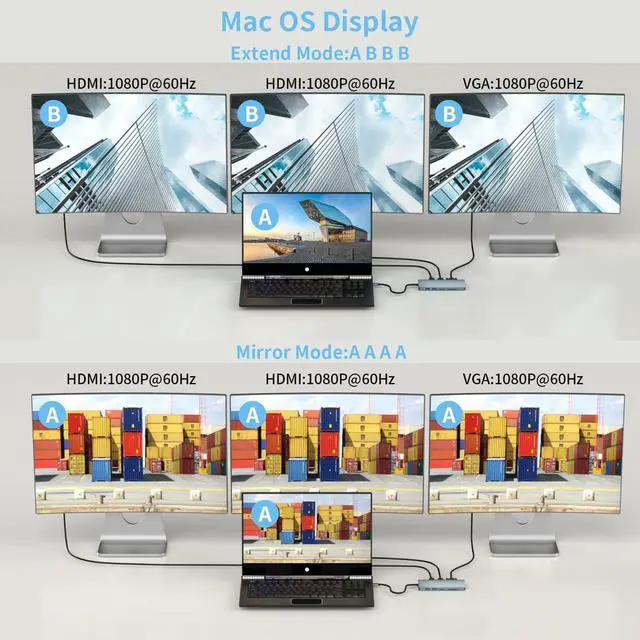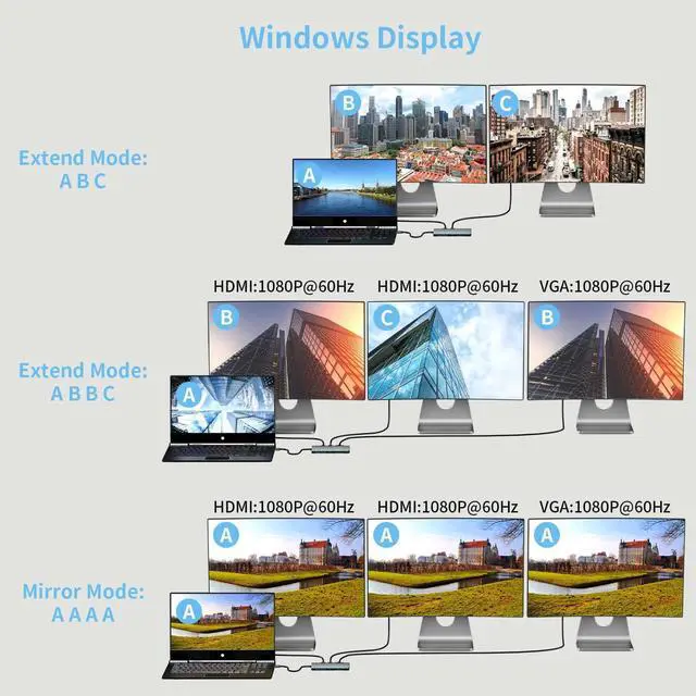 WINDOWS triple displayTriple display: HDMI+HDMI+VGA, but only Windows system supports triple display; Mac OS is not supported. Mirror or extend your screen with a USB C adapter monitor. Stream 4K Ultra HD or Full HD 1080P video for a cinematic feel. When using the same screen function, the HDMI inte