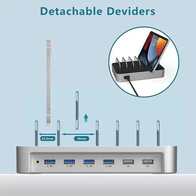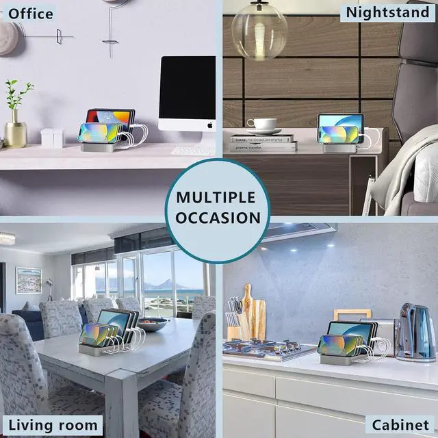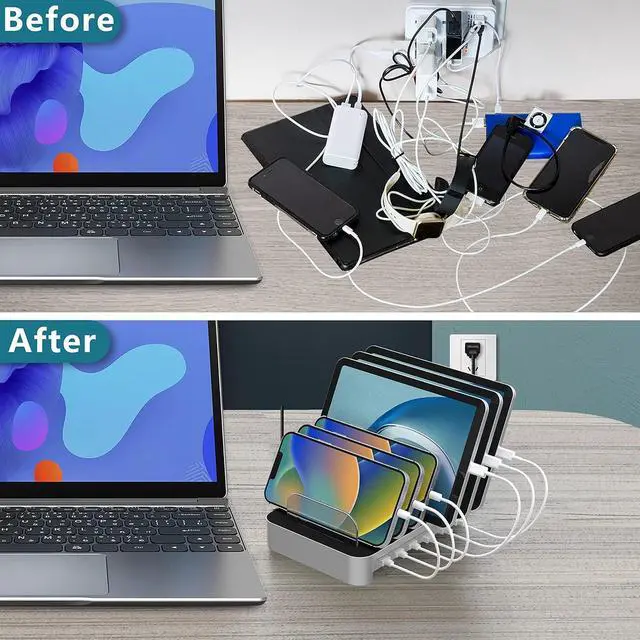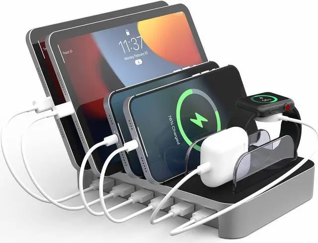 Next page BONFAD charging station for multiple devices can keep your smartphone, tablet and other devices organized on your desktop or counter. NO more cluttered cables, NO bunch of chargers, everything in one place.