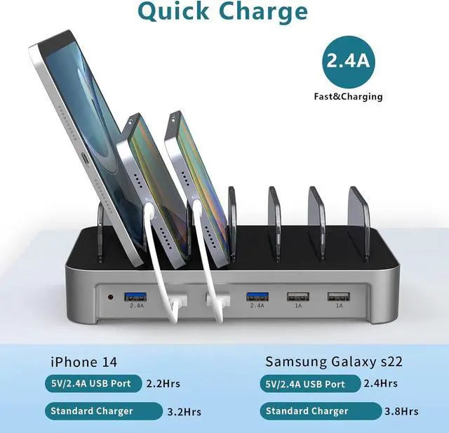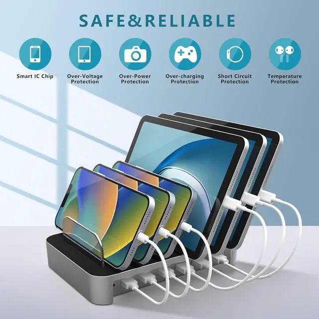 6. Easy to use, connect the charging station to the power cord into a wall outlet, and a red light on the station will indicate that it is powered on and ready to charge your devices