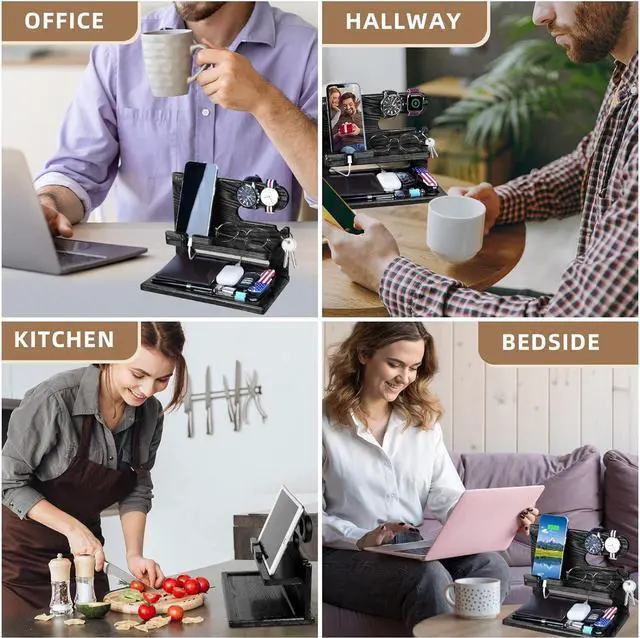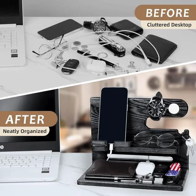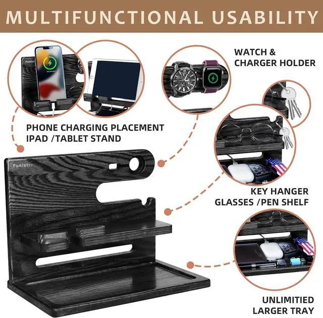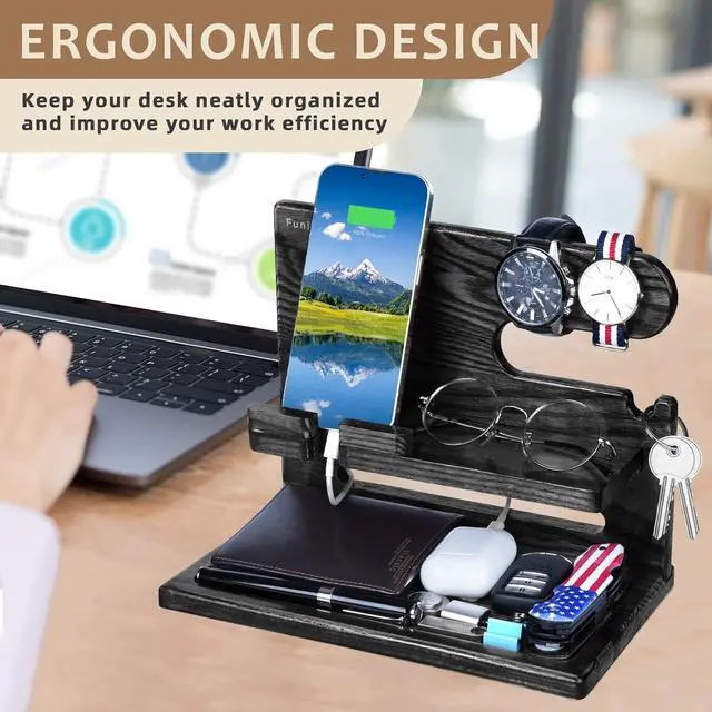 Gifts for Dad Gifts for Husband Gifts for Men EXCELLENT QUALITY & HIGH STANDARD CRAFTSMANSHIP MULTIFUNCTIONAL PHONE DOCKING STATION Funistree wood desk organizer can be a KEEP ALL ESSENTIAL BELONGINGS ORGANIZED Say goodbye to the cluttened desk and concentrate on your work! STURDY SCREW FIXATION LARGER STORAGE TRAY MULTI-DEVICE CHARGING DESIGN FOR DIFFERENT DEVICES