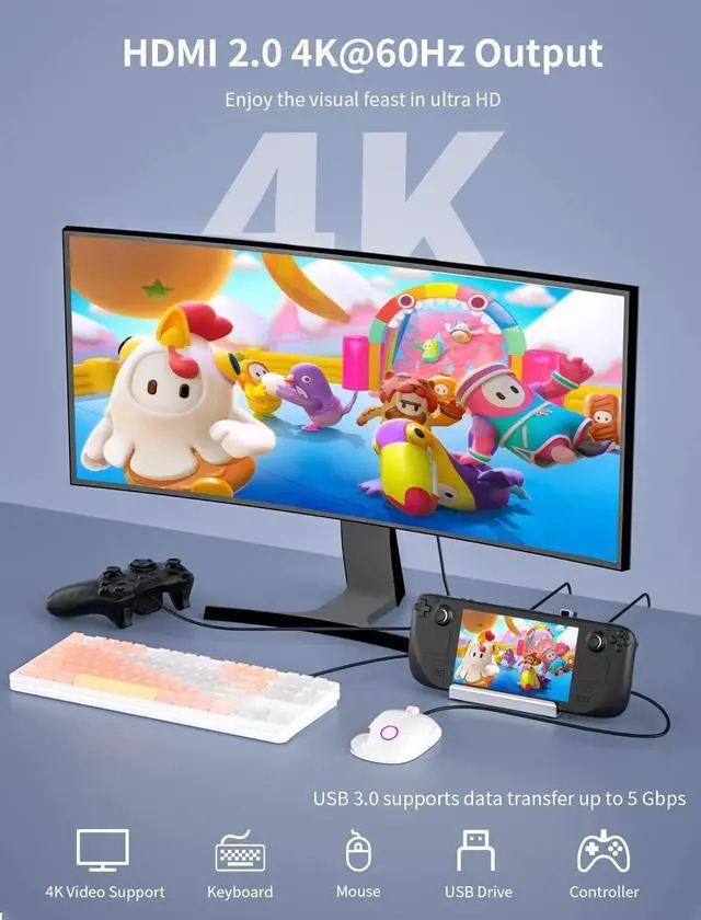 The Dock comes with a 4K@60Hz HDMI 2.0 output. When you connect an external 4K monitor or TV, it can provide you sharper and smoother visual experience, so you can enjoy the visual feast on your games.