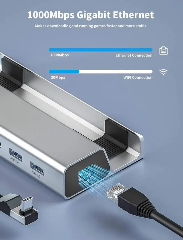 The Ethernet Port supports a maximum of 1000Mbps. When you connect the docking station to the Internet cable, you can download games faster and watch videos more smoothly.