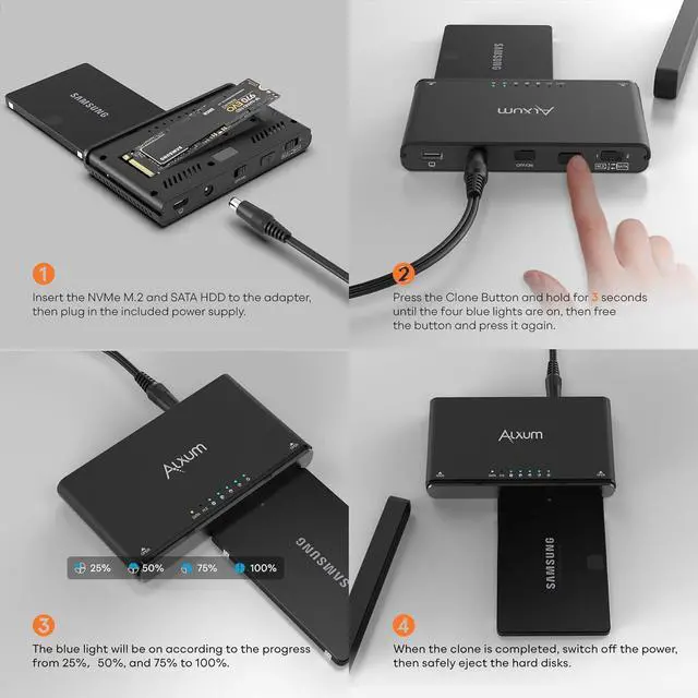 High Speed Data Transfer:Alxum M.2 ssd reader NVMe duplicator experience lightning-fast data transfer rates of up to 10Gbps using the USB 3.2 interface, supports PCle Gen 3x2 NVMe 13 M2 SSD, enabling superb performance and accelerated data processing, for SSD TRIM pointing and UASP acceleration further enhances overall system responsiveness.