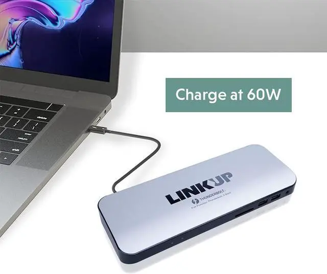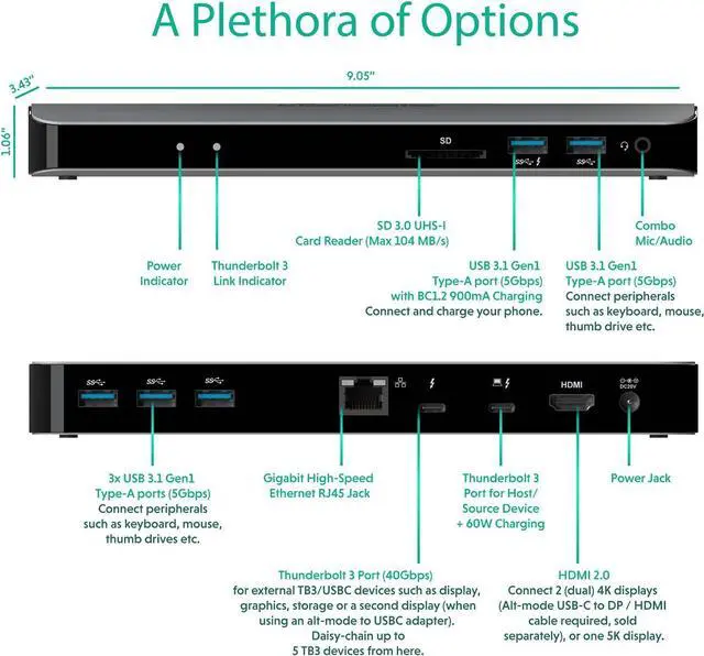 (10Gbps), 4 x USB-A 3.0 ports (5Gbps), an SD memory card slot, Gigabit Ethernet LAN, and one combination audio and microphone port. Daisy chain up to 5 TB3 devices. Connect it all with 1 x Thunderbolt 3 upstream port and charge at the same time.