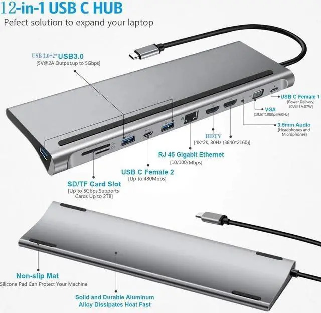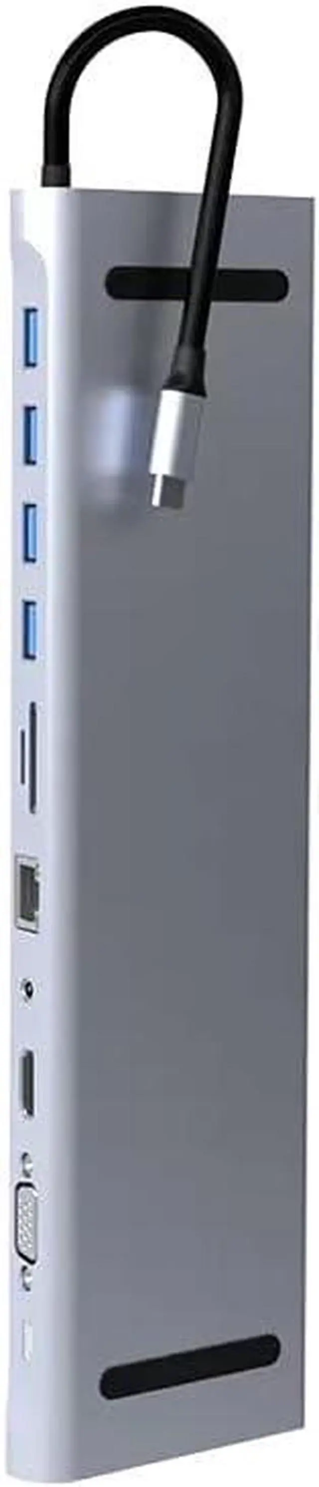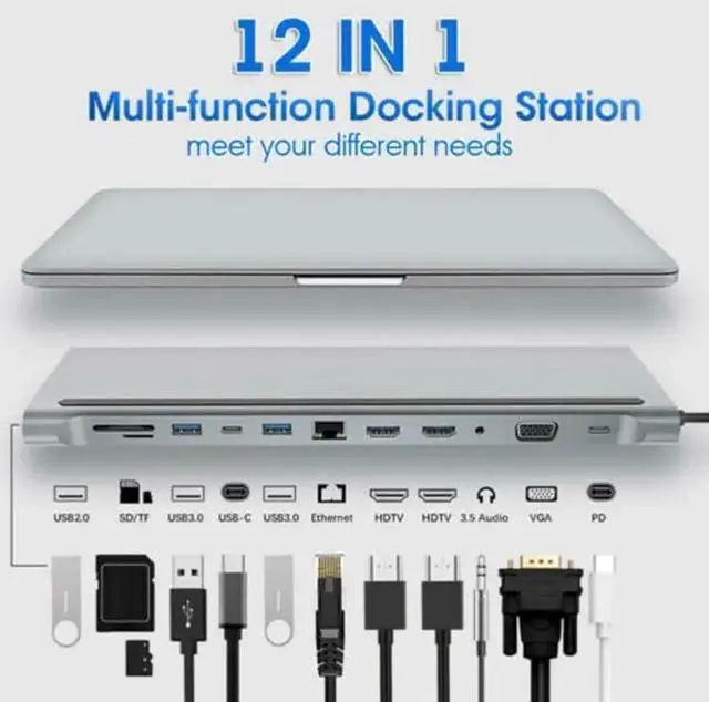 12 in 1 USB-C Docking Station with 4K Display, HDTV and VGA Adapter for Multi-Port Monitor Setup.