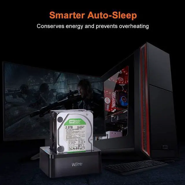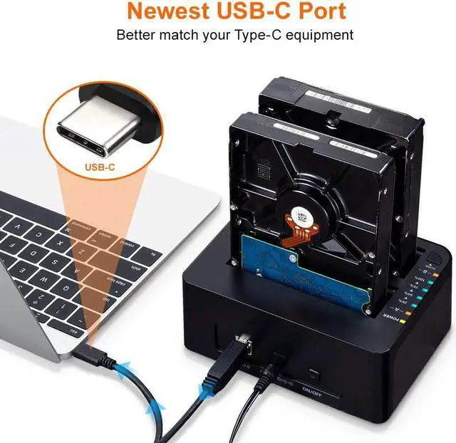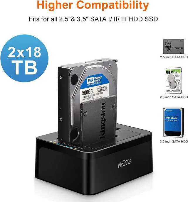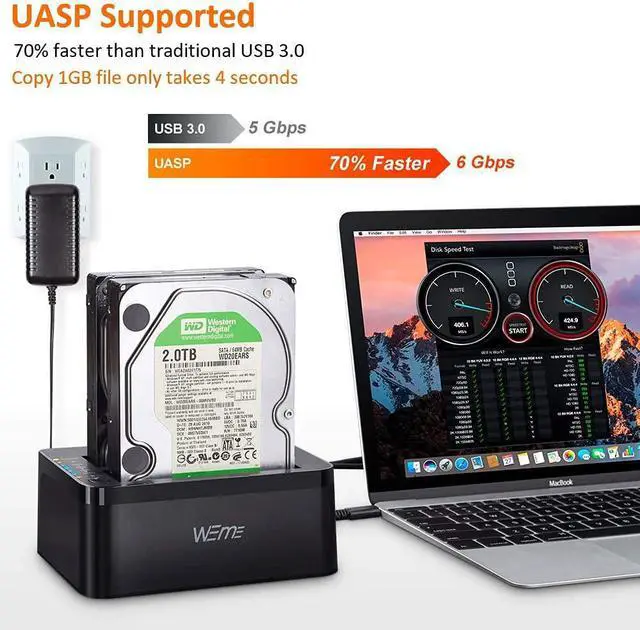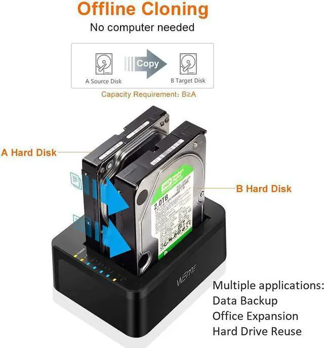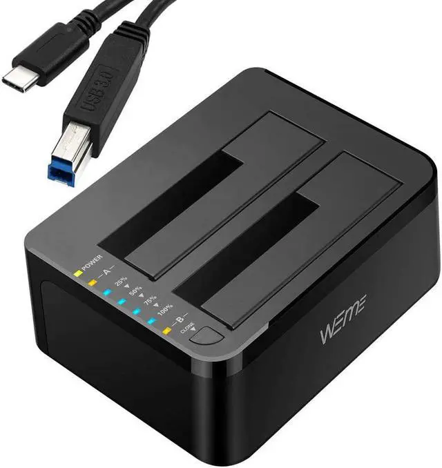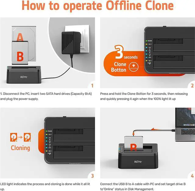WEme USB-C Hard Drive Dock supports data copy and clone between any two 2.5" and 3.5" SATA I/II/III HDD and SSD up to any capacity. Moreover, it adopts SuperSpeed USB3.0, data transfer rate up to 5Gbps, and SATA3 (6Gbps). Its excellent transmission performance and compatibility are convenient for data exchange and perfectly suitable for people who need to process clone data regularly, such as film and television production, Backup & processing IT data, Schools batch processing data, etc To use the Offline Clone Mode: 1: Insert the disks to A & B slots respectively. A is the source disk to be cloned, B is the target disk. 2: Connect the 12/3A Power Adapter. 3: Power on the docking station, press and hold the clone button for 3 seconds. 4: When the LED indicator that marks 100% clone progress light up, quickly press the button again, then the offline clone starts. 5: One by one 4 LED indicators will flash and be on 25%-50%-75%-100%. 4 LED lights will stay on when the offline clone is 100% completed. Notes - When cloning, the capacity of the disk (B) should be larger than the disk (A). - Please backup files in the target hard drive before cloning. Any files in the target hard drive will be overwritten when offline cloning occurs. - The cloned drive is in offline status after the clone finished. Please set the status of the disk to online on Computer "Disk Management". - Please make sure to connect the 12V3A power supply to offer stable power. - To avoid data loss, don't try to insert or withdraw HDD or SSD when the hard drive running. Questions: Q: HDD does not show up under Windows Explorer? A: Go to Disk Management, right-click the 'Unallocated' or 'Free space' to assign a drive letter for the disk. Q: Indicator stops flashing during offline clone period? A: The reasons may be partial damage of HDD, a virus in clone data or malfunction, etc.