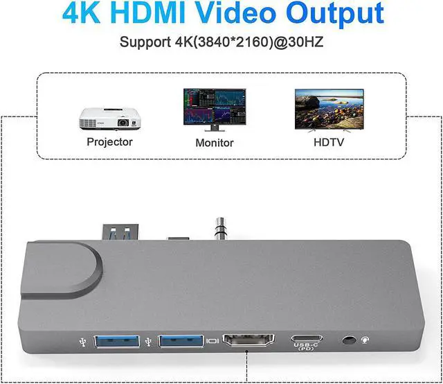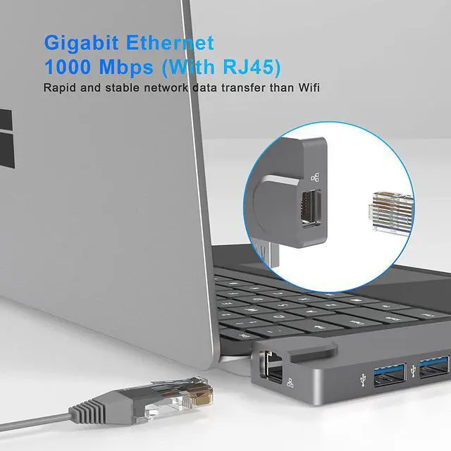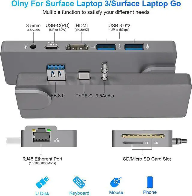 Surface Laptop 5/Laptop 4/Surface Laptop 3/Laptop Go Hub with 4K HDMI, RJ45 Gigabit Ethernet,60W Type-C Charging Port,2X USB 3.0 Ports,USB3.0 SD&TF Card Reader adapter,3.5mm Audio Port.Surface Laptop Dock is only design for Surface laptop 5/laptop 4/laptop 3/laptop Go,with has aluminum alloy surface, compact and beautiful shape.