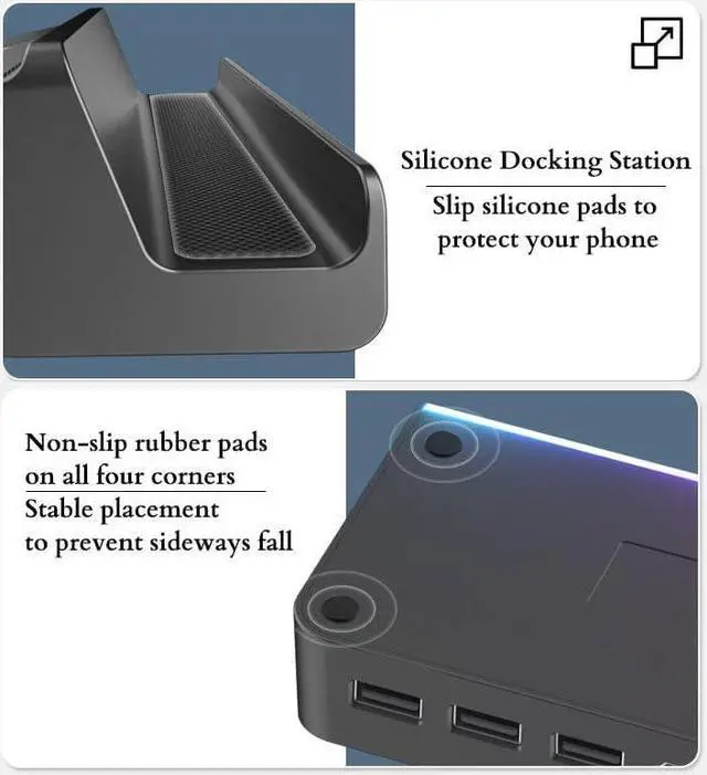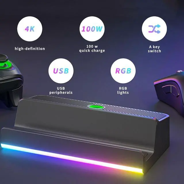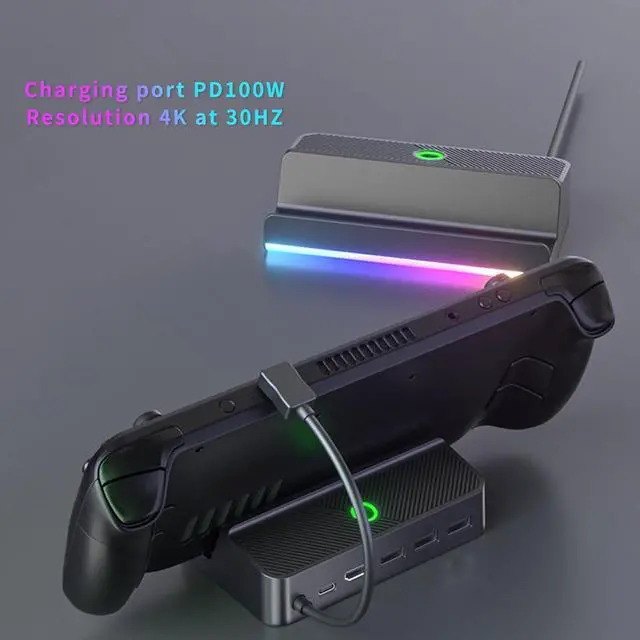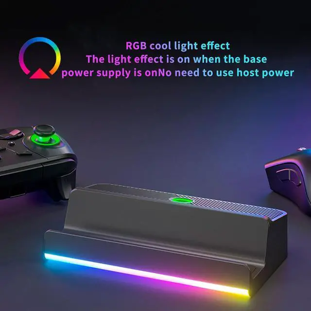 Steam Deck base stand has RGB Razzle effect, the light effect will light up when the base power is turned on, no need to use the host power. The size is about 13*8*3.7CM, made of ABS material, sturdy and durable.