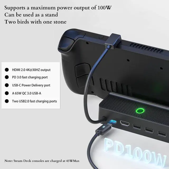 5-in-1 dock for Steam Deck with one HDMI 2.0 4K@30HZ output, one PD 3.0 fast charging port, USB-C Power Delivery port and one 65W QC 3.0 USB-A,2 two USB2.0 fast charging ports, supports fast charging for Steam Deck and most mobile devices.