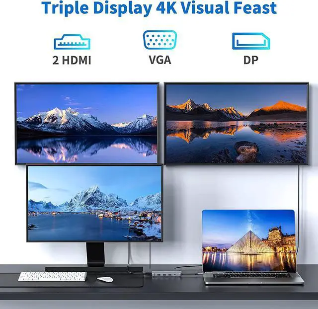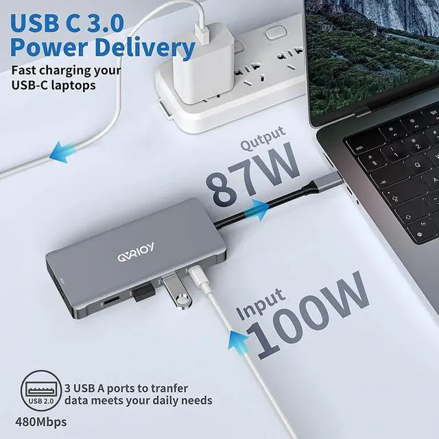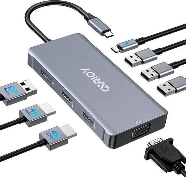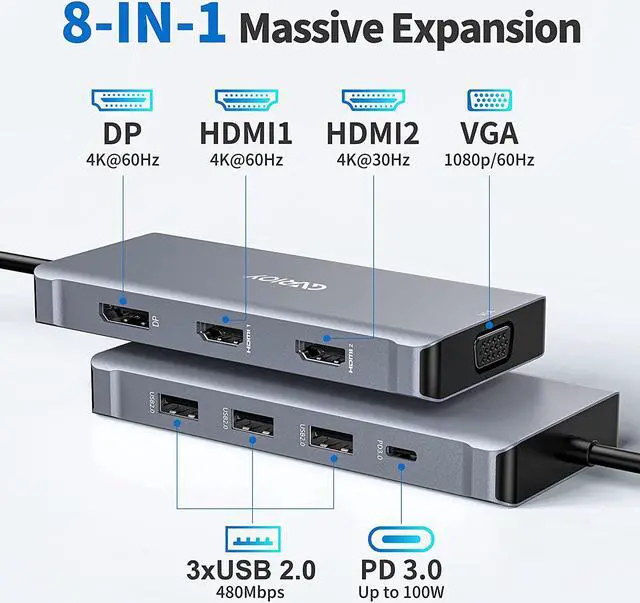 The GVRIOY 8 IN 1 USB-C HUB adds multiple connections to your USB-C laptops just by using one USB-C port. It features 2 HDMI, DP, VGA, 3 USB2.0, PD3.0 slots to your computer.