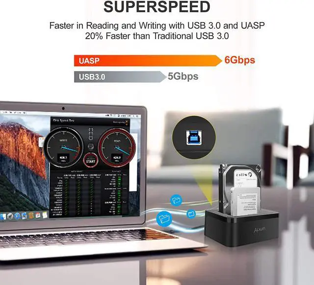 Super Speed Hard Drive Docking StationEquipped with USB 3.0&SATA III(6 Gbps) and UASP for optimal performance; Only takes 15 seconds to copy 4GB files. Backward compatible with USB 2.0 /1.1.