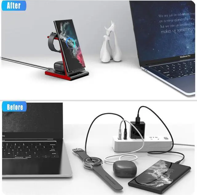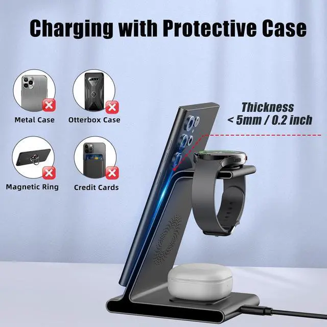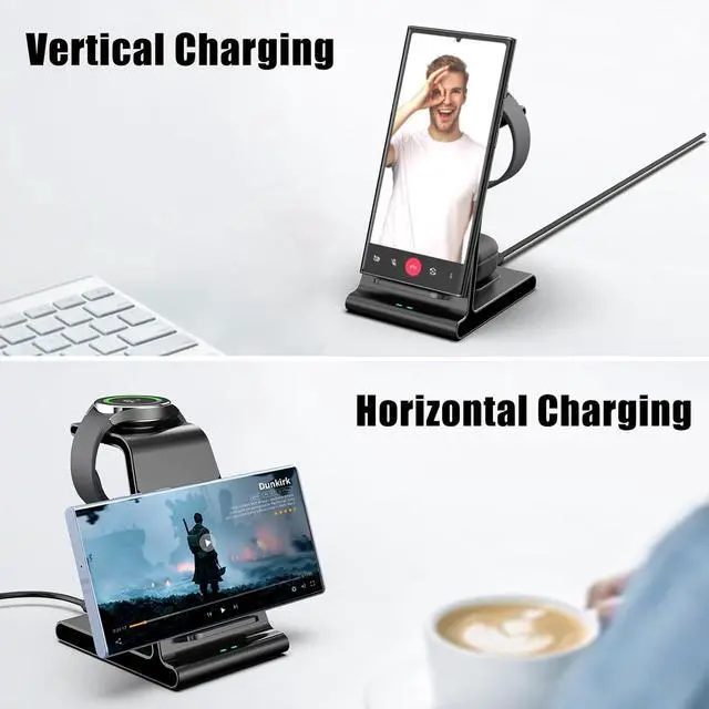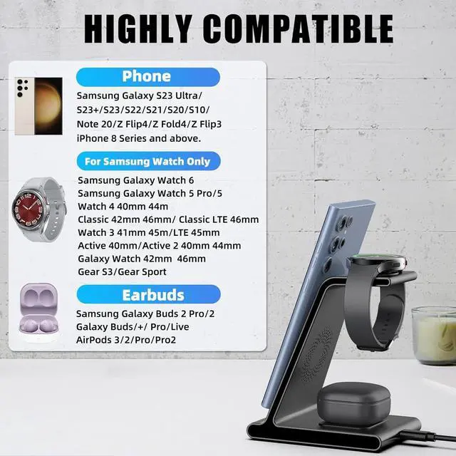 Phone:10W:Samsung Galaxy S23/S23+/S23 Ultra/S22 Ultra/S22/S21/S21 Plus/S20/S20+/S21 FE/S10/S10+/Note10/S9/S8+, Z Flip 4/Z Fold 4/Z fold 3/Z fold 2/fold/Z flip 4/Z flip 3 etc. The Z series can only be charged when placed vertically Phone:7.5W: iPhone 13/13 Pro/13 Mini/14/14 Plus/14 Pro/14 Pro Max/12/12 Pro/12 Pro Max/12 Mini/11/11 Pro/11 Pro Max/SE/XR/XS/X/8/8 Plus, etc.Phone:And Other phones that support wireless charging.Smartwatches:2.5W: Samsung Galaxy Watch 5 Pro/Samsung Galaxy Watch 5/Galaxy Watch 4/Watch 4 Classic/Watch 3/Watch Active/Watch Active 2.Smartwatches:NOT for Gear 1/2ve/S/Gear Fit/2/e/Galaxy Watch/Gear S3 S2 S4, Sport.Earbuds: 5W:Samsung Galaxy Buds 2 Pro; Samsung Galaxy Buds 2; Galaxy Buds/Buds+/Buds Pro/live; AirPods 3/2/Pro; And Any earbuds that supports wireless charging. Designed with intelligent Heat-emission Hole, keeps the wireless charger and your watch earphone running at a low temperature to ensure the highest charging speed.