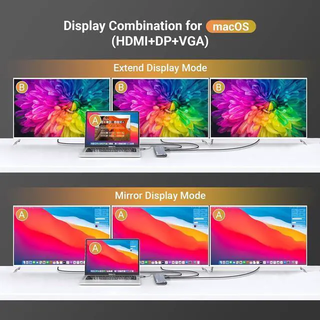 For Mac OS laptop, it can ONLY support extend ONE different monitor, display like A+B+B+B. Or support mirror mode, display like A+A+A+A, the resolution of all three monitors can be up to 4K@30Hz.