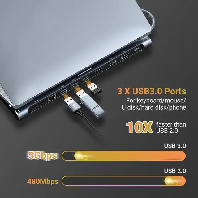 3 x USB 3.0 ports (up to 5Gbp/s) connect smartphones, tablet, hard drives, for effortless data transfer with USB-C port, also allow you to connect keyboard or mouse without any lag of this laptop docking station.