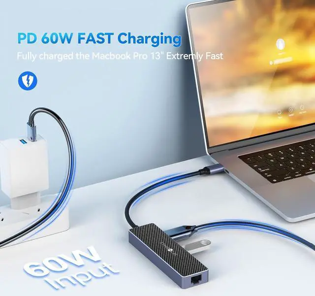 60W Power DeliveryThe docking station's PD port provides up to 60W of continuous power to your USB C devices while transferring files or streaming, eliminating power outage worries. Note: PD port does not support data transmission.