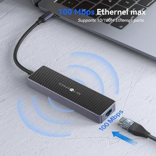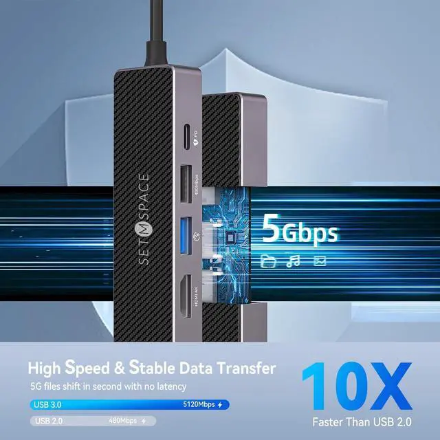 Efficient USB C HubWith high-speed USB-A 3.0 and USB-A 2.0 ports, enjoy fast data transfers of up to 5Gbps and 480Mbps respectively. The docking station also includes an Ethernet port for stable internet connections, allowing seamless streaming and quick file downloads. No need for software or drivers, transfer HD movies or large files in seconds.