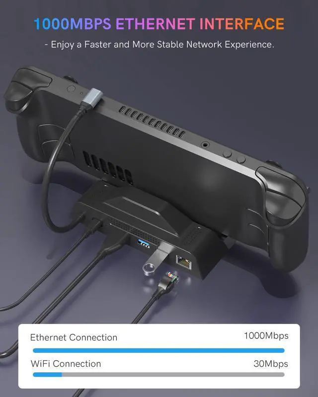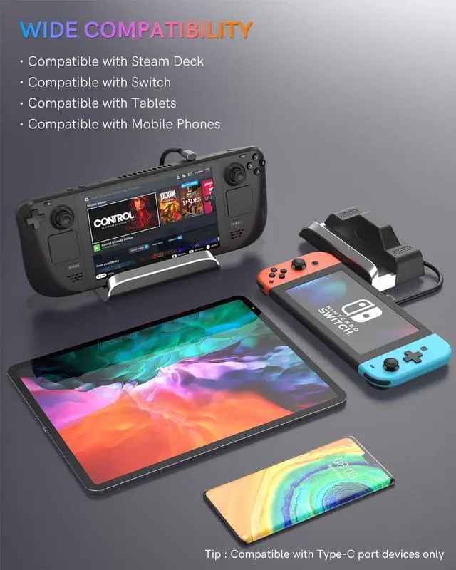 5-IN-1 TV DOCKING STAND: Designed specifically for Steam Deck, this docking stand features a 4K HDMI output, a USB Type-C PD fast charging port, and 3 USB 3.0 data ports. Charge your device while playing games on your TV and easily connect keyboards and mice for desktop mode. Enjoy an enhanced gaming and desktop experience with the 4K@ HDMI output, and keep your desktop tidy and organized with the hub and stand functions combined in one device. This docking stand is compatible with not only Steam Deck but also Nintendo Switch, tablets, smartphones, and more.