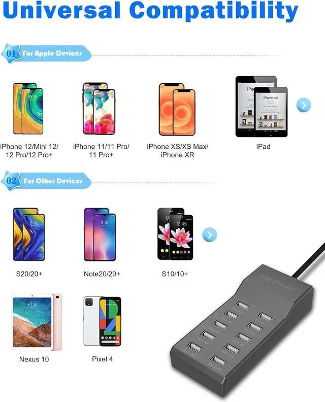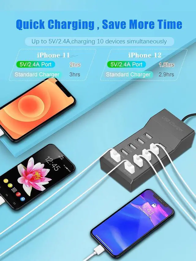 Support 10 devices charged at the same time, each port intelligently identifies your device and seeks a maximize its charge speed.