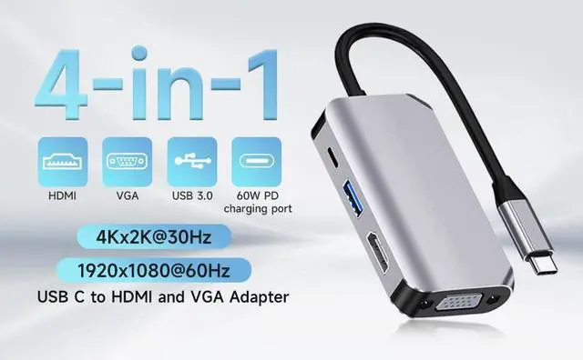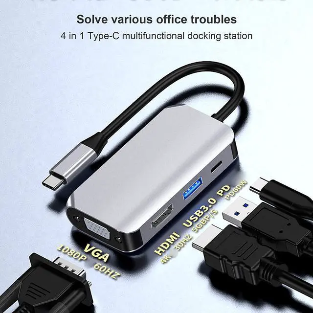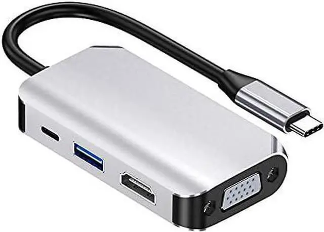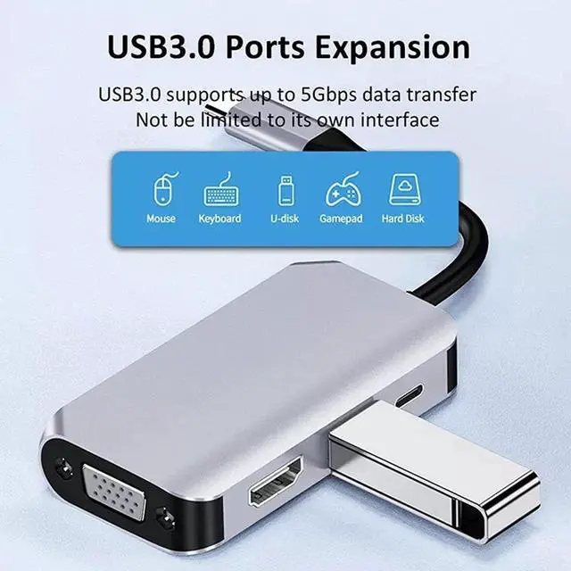 4-in-1 Instant USB C Hub ExpansionThis USB Type C Hub, Splitter, Docking Station and Multi Port Adapter has built in high speed USB3.0 Data Transfer port, Type C PD fast Charge, 4K@30HZ HDMI output port and1080P@60Hz VGA output port. The USB 3.0 port is capable of 5Gbps data rate, connecting to your smartphone, tablet and other hard drives for quick data transmission. And all hub ports can work simultaneously, small yet mighty.